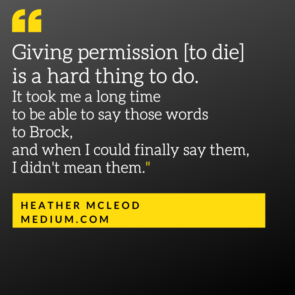 Giving permission is a hard thing to do. It took me a long time to be able to say those words to Brock, and when I could finally say them, I still didn’t mean them. But giving permission is a normal part of the dying process, and sometimes the dying person waits (and suffers, in pain or discomfort) until they get that permission before they’ll let go.