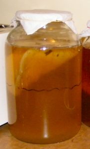 Over the next 7-10 days, Abigail will produce a “baby” SCOBY, which will float above her on the surface of my fermenting kombucha. On day 7 I’ll taste the kombucha, and if it taste right (not too sweet, not too vinegary) then I’ll decant the kombucha into glass jars for storing in the fridge and drinking. I’ll move Abigail into a glass jar with some of the kombucha, and keep her in the fridge as my “back-up” SCOBY for future kombucha batches.