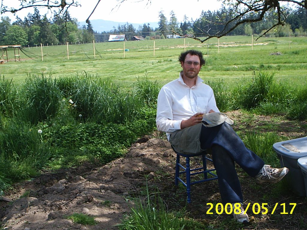 Aside from our successful day (coincidentally also the hottest day of the year so far – whew), the highlight was definitely meeting Tara and Cameron, a young couple who live in Vancouver with their dog, Rex. They’re interested in starting their own farm and came to the Island for a four day “farm honeymoon” to meet farmers and test out the community vibe. We met them at the farmer’s market and invited them to visit us in the afternoon so they could see our farm, and during our subsequent 2.5 hour visit Brock and I fell in love with them. Aside from being Good & Nice People, they are as interested in all the weird “food” stuff that we are — Tara even knew about how mainstream carrots used to be purple, red and white before the Dutch got their hands on them. They’ve been reading the same self-sufficiency books and had visited/worked on the hops farm in Sorento where we bought our hops this year. They actually opted to drink our well water when we sat out on the patio — they love well water, compared to the processed city water they’re used to. They were so poetic about well water “keeping you in touch with your farm” and being “natural” that Brock and I have almost been converted ourselves. We’re excited to see them again. I can’t wait to hear what they think of Barbara Kingsolver’s Animal, Vegetable, Miracle.
