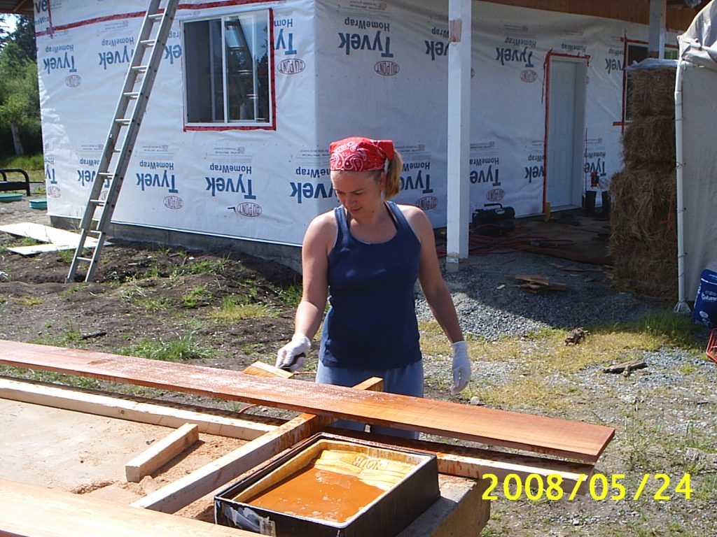 Perhaps the greatest development on the farm these days is that our home is (almost) finished. My brother Joe is a journeyman carpenter, and he’s been staying with us while finding an apartment and work in Victoria. He sided our house, did the soffits and gutters, and helped pour (and stamp) concrete patios in the front and back. He also built me a huge farm stand for the front area.