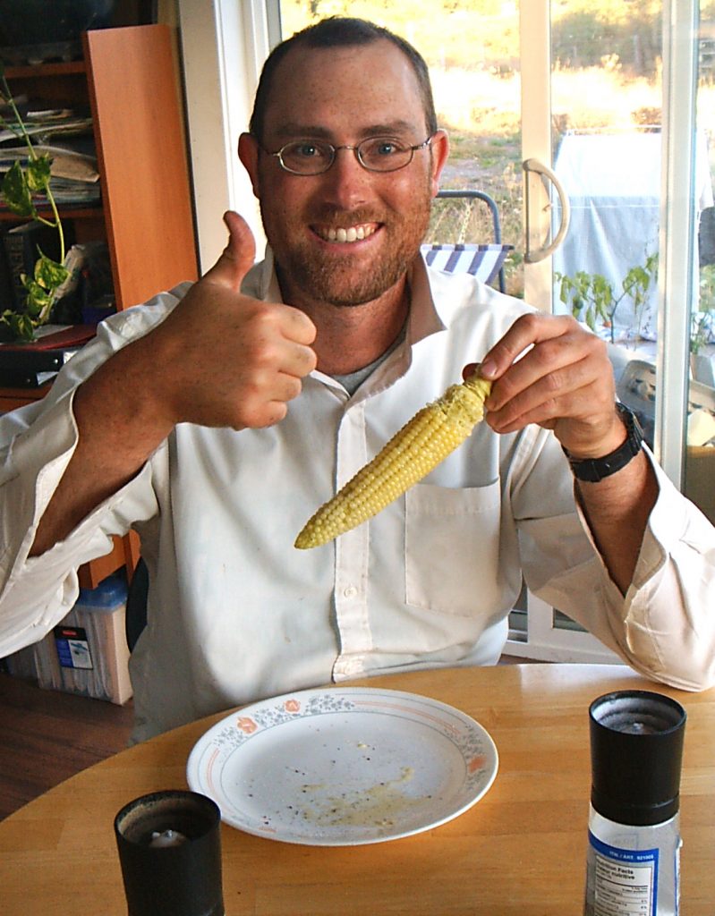 Brock gives our first ever sweet corn cob a thumbs up of approval.