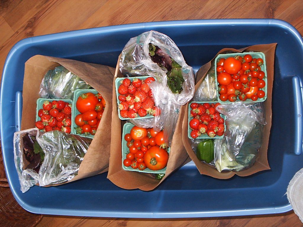 Harvest Share bags, ready to be picked up.