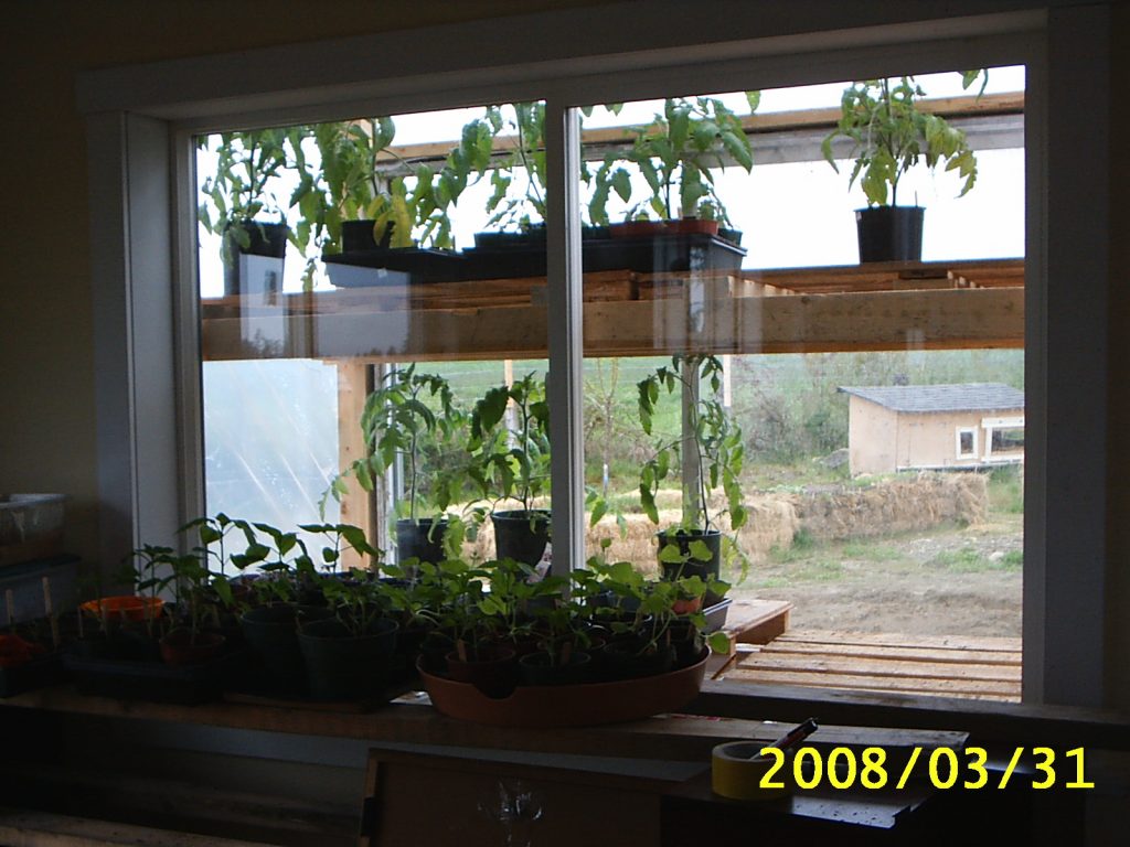 2. We also built a small greenhouse onto the Southwest side of our home. It’s temporary, since we only need it for another month or so, but it’s a huge relief not to be sharing our living space with 1,000,000 tomato plants – no matter how yummy they smell. We’re hoping the attached design will keep them warm enough overnight. We’ll be monitoring the thermostat throughout the night, and might have to do a midnight rescue, but hopefully this will solve our limited-space, too-many-goddamn-tomatoes problem.