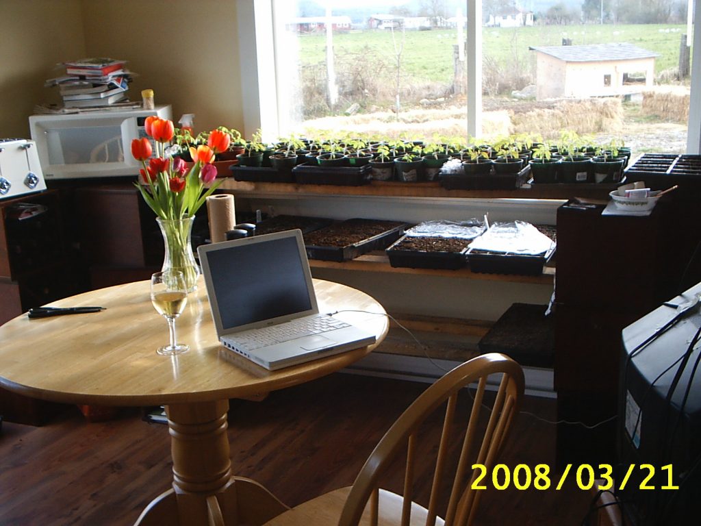 In other news, we had a great weekend. Four days of being farmers, doing farmy things on our farm. Brock spent most of the time outside, while I planted more tomato seeds and attended to my wee plants indoors. We visited with Kyle & Chrissy, Byron, Craig & Sharon & Gavin, Randy & Debbie, my Aunt Pat and Gramma Walker, and had a huge Easter dinner at the Cutler’s in Genoa Bay. Monday we ate crab in the shell for lunch (thank you, Jim Cutler!!) and steak and asparagus for dinner. (The asparagus was from California — we’re not eating Mexico-grown asparagus anymore. I’d tell you why but it involves fertilizer sprays and that’s unpleasant.)